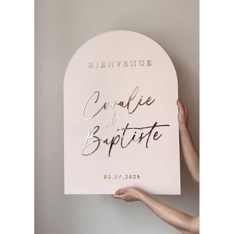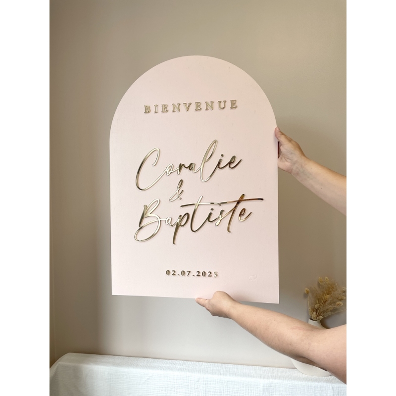 Décorez votre lieu de réception de mariage avec ce joli panneau de bienvenue en bois peint. Vos prénoms et la date de votre mariage sont mis en valeur grâce au plexiglas miroir champagne, pour un rendu classe et haut de gamme.