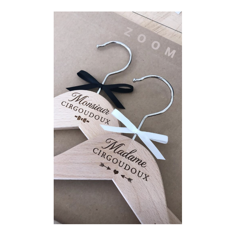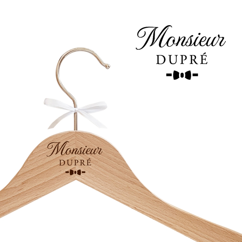 La commande comprend la gravure du cintre avec les textes de votre choix. Il est possible de supprimer le motif du noeud papillon. Aucun autre motif ne sera ajouté.