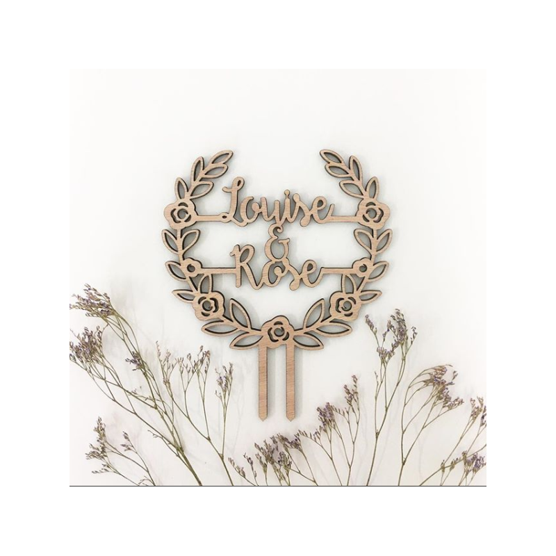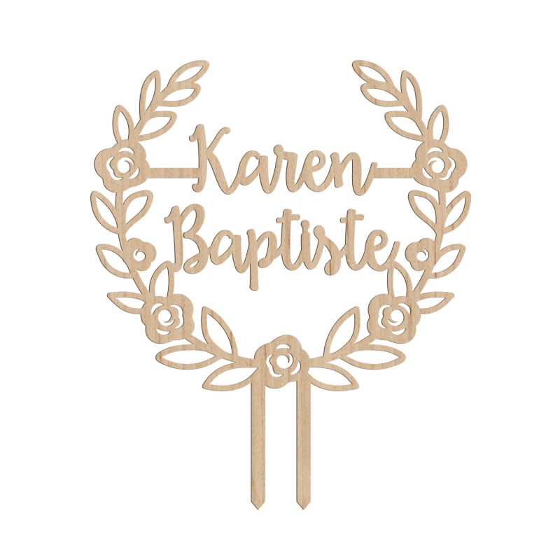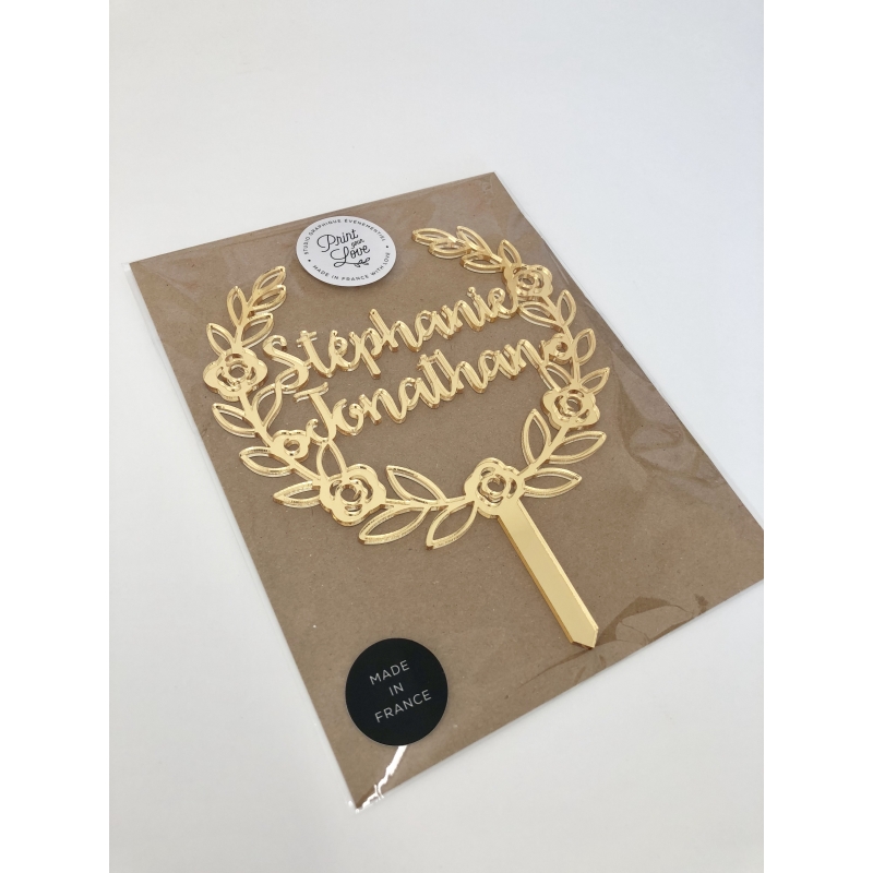 Pour votre mariage fleuri, ajoutez un cake topper personnalisé sur votre pièce montée. Ce modèle mettra parfaitement en valeur vos prénoms au centre de sa jolie couronne de fleurs. Succès garanti au moment de l'arrivée de votre dessert !
