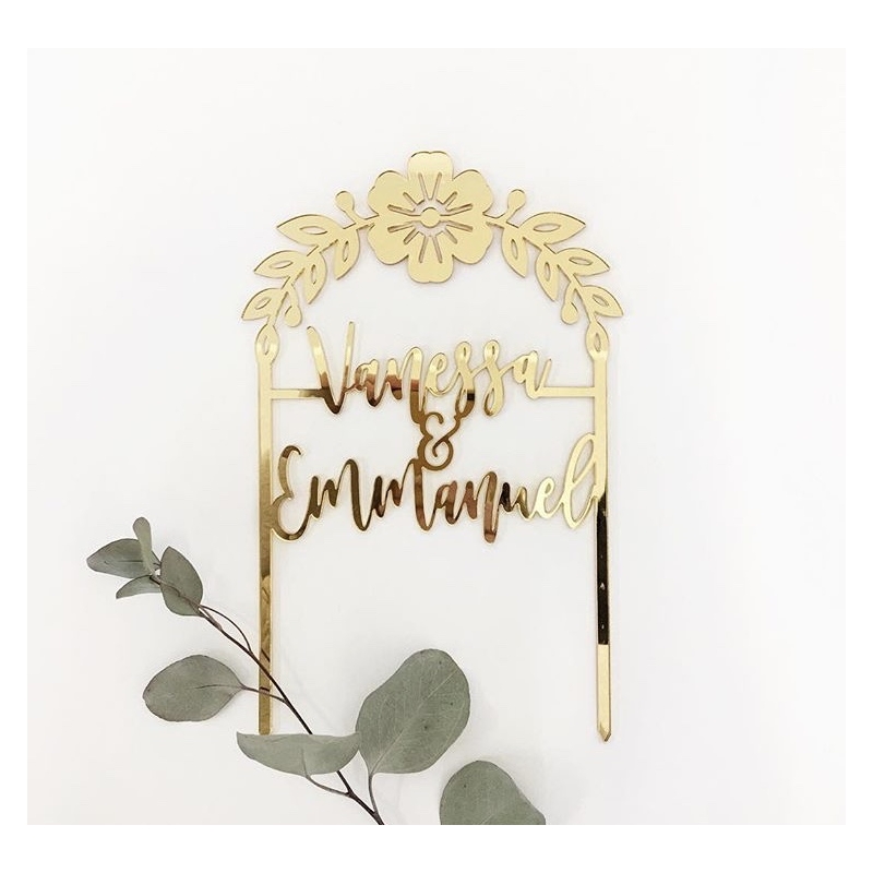 Décorez votre gâteau de mariage avec un joli cake topper en bois personnalisé avec vos prénoms. Ce modèle  a été réalisé en forme d'arche florale en clin d'oeil à votre cérémonie laïque. Ce cake topper en bois est personnalisé avec vos deux prénoms en calligraphie.