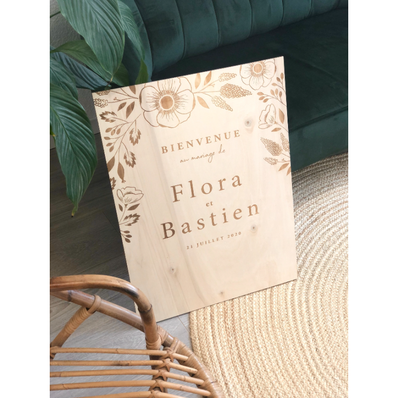 La commande du panneau en bois comprend la personnalisation avec vos prénoms et la date de votre mariage, ainsi que sa fabrication. Vous avez également la possibilité de choisir l'option "Ajout de plexiglas" sur vos prénoms (en sus).