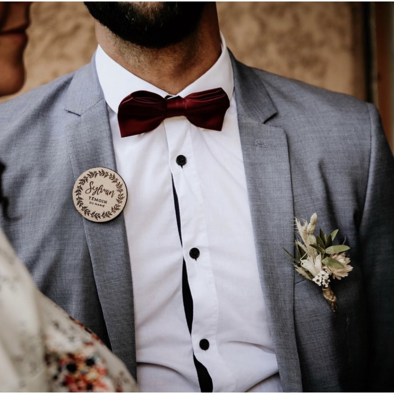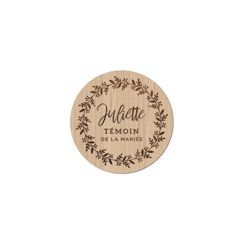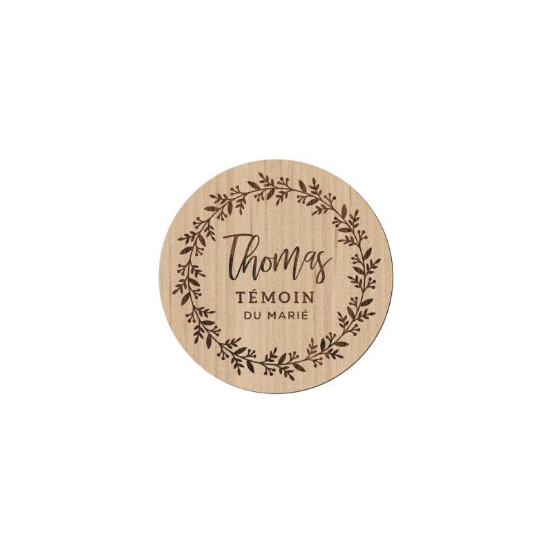 Vous voulez que vos convives identifient vos témoins et/ou votre famille ? Les badges en bois personnalisés seront un moyen parfait pour les reconnaître ! Le modèle Couronne de feuillages est personnalisable avec un prénom et un "titre" (exemple : Papa de la mariée...). Après votre mariage, vos convives pourront garder leurs badges en souvenir.