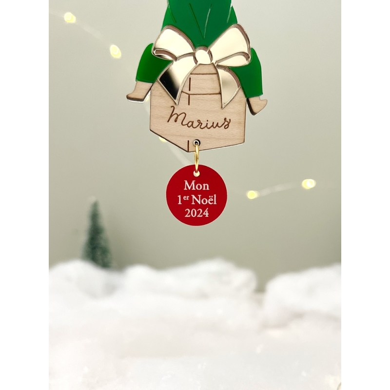 Pour Noël, ajoutez de la couleur et de la magie dans votre sapin grâce à cette boule de Noël personnalisée en forme de lutin et son cadeau. On craque complètement pour son joli minois et ses couleurs qui rappellent les traditions de Noël. Sur le cadeau, ajoutez un prénom pour en faire une décoration de sapin unique !