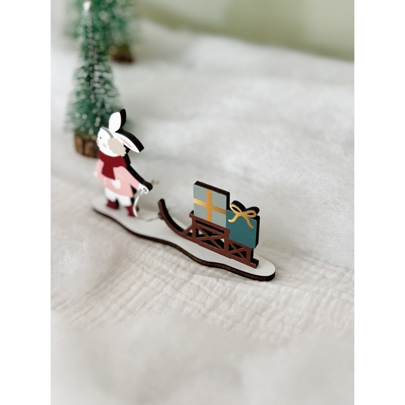 Complétez votre Mini monde de Noël en bois avec Léontine la lapine et sa luge chargée de cadeaux. Ce petit personnage, prêt à rejoindre son amie Suzy la souris pour le réveillon, apporte une touche de poésie et de tendresse à votre village de Noël miniature. Une figurine artisanale pleine de charme pour faire vivre la magie des fêtes dans votre décoration de Noël.