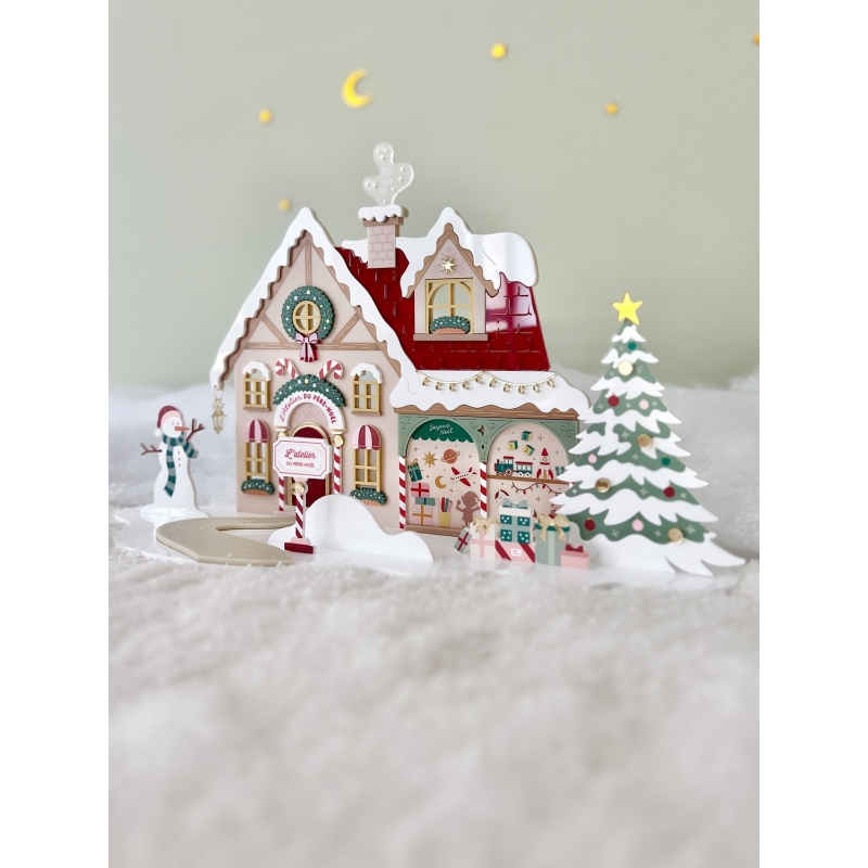 Bienvenue dans L'univers enchanté du Père Noël, le coeur du Mini Monde de Noël. Ce décor transporte petits et grands au Pôle Nord, là où les jouets prennent vie, où la neige scintille et où la magie de Noël s’anime à chaque regard. Sous la neige immaculée se dressent l’atelier du Père Noël, un sapin décoré, un bonhomme de neige et une allée enneigée menant jusqu’à la porte rouge emblématique.