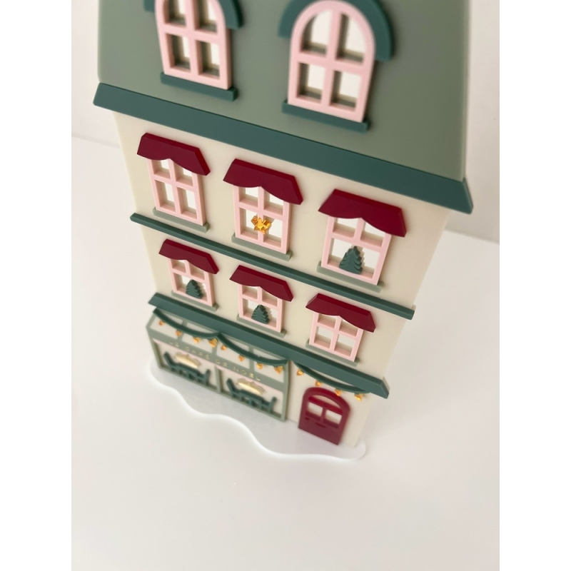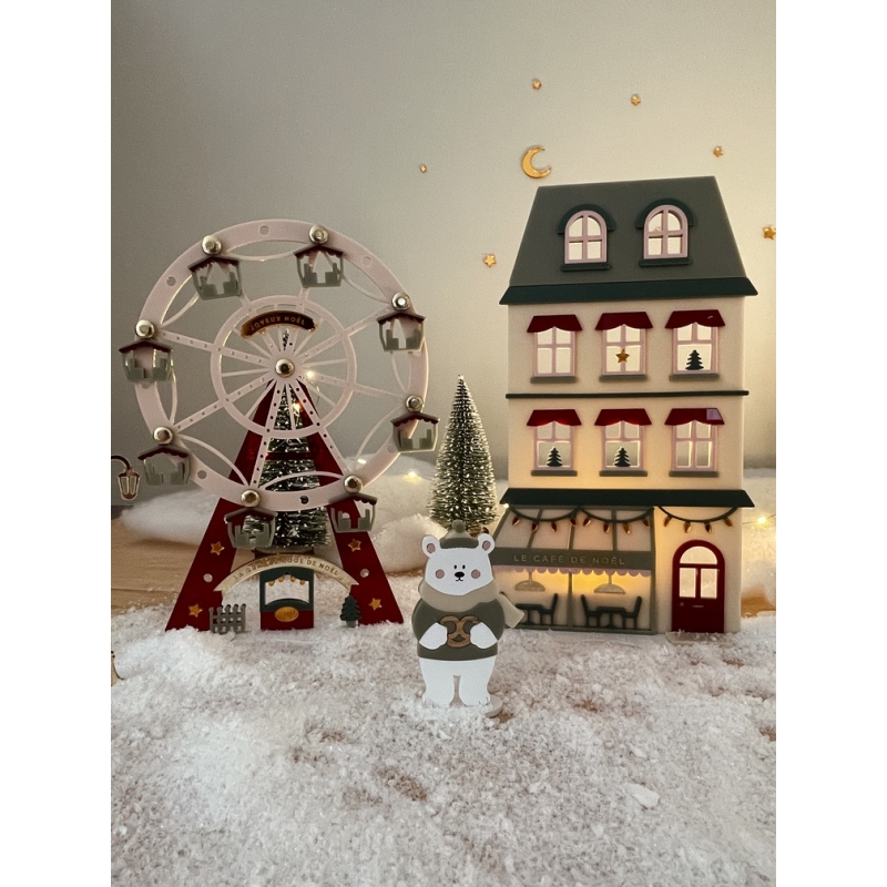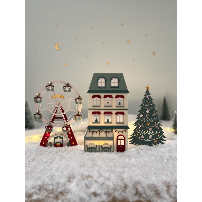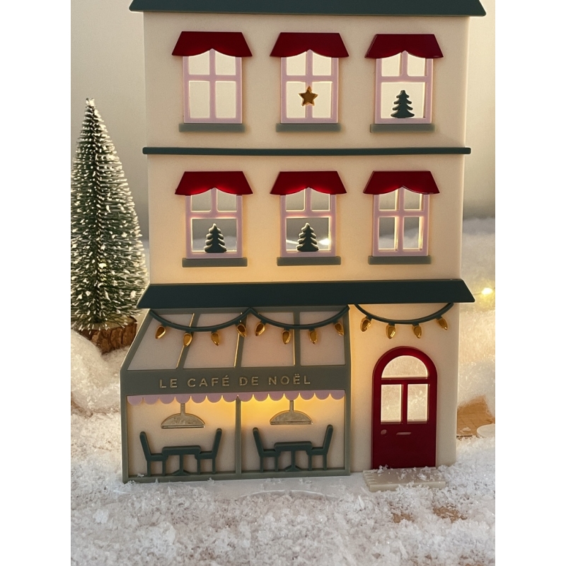 La Maison de Noël et son café a été imaginée, fabriquée et assemblée dans notre petit atelier alsacien. Elle vous sera livrée montée, il vous suffira de rajouter le socle blanc pour la faire tenir debout.