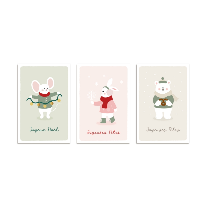 Craquez pour ces jolies cartes de voeux déclinées de notre collection : mini monde de Noël. On y retrouve une carte postale pour Gaston l'ourson, Léontine la lapine et Suzy la souris. Des illustrations douces et poétiques à offrir ou à s'offrir !