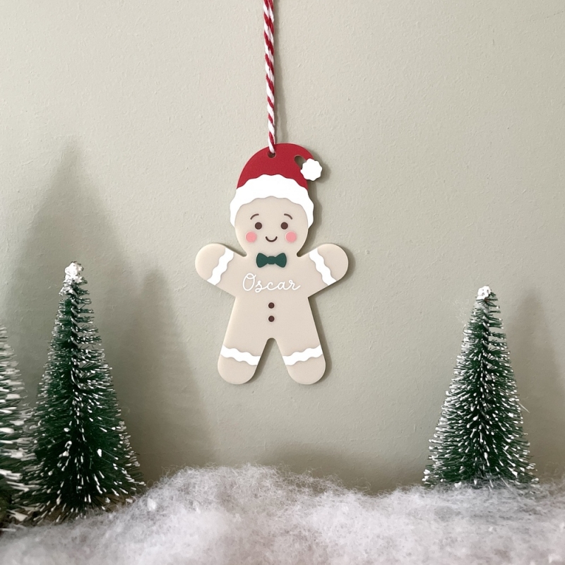 Ajoutez une touche de gourmandise et de fantaisie grâce à cette décoration de sapin de Noël Pain d'épices. La suspension de Noël est réalisée en plexiglas coloré et est personnalisée avec le prénom de votre choix pour un rendu unique. Une décoration de Noël originale à s'offrir ou à offrir !