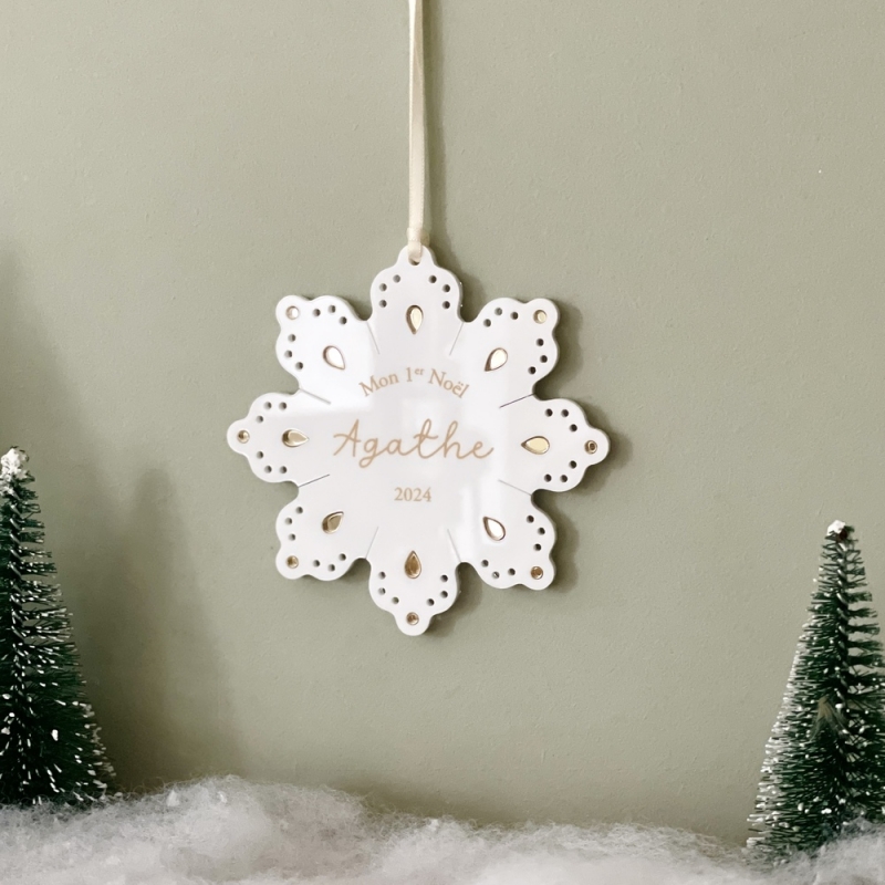 Décorez votre sapin de Noël avec ce flocon scintillant, une suspension unique alliant élégance et douceur. Ce modèle vous plaira pour son mélange de plexiglas blanc et ses petits détails en miroir champagne qui brillent à la lumière. Le flocon est personnalisable avec un prénom ou un nom de famille pour en faire une boule de Noël originale.