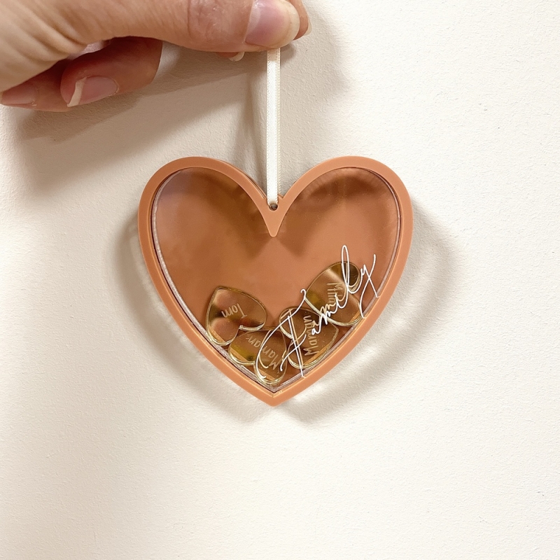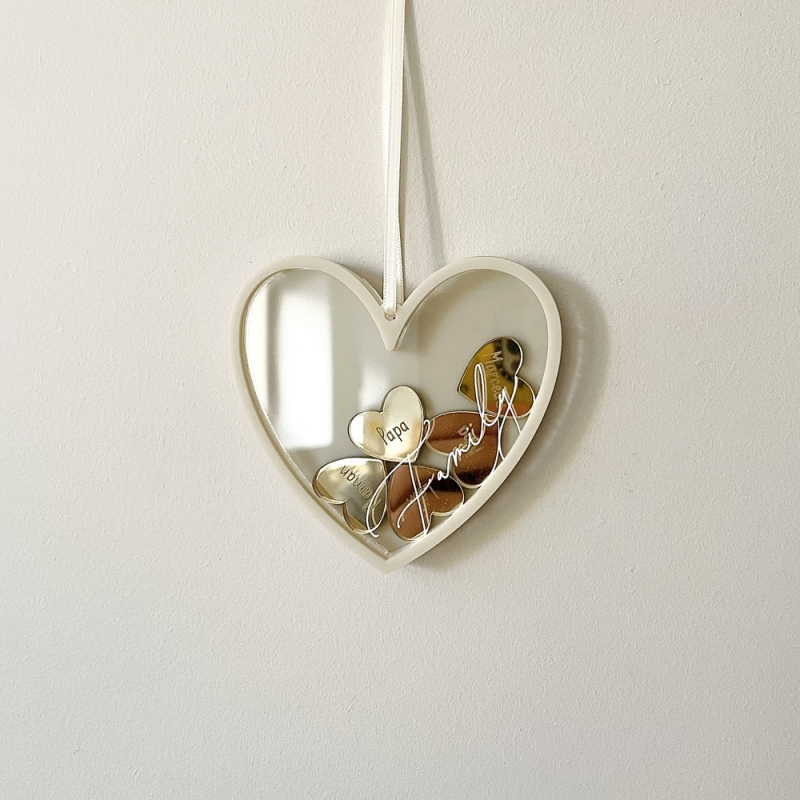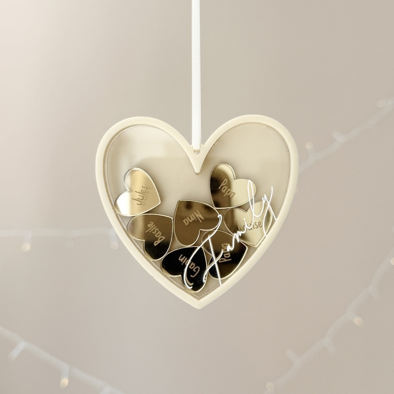 Vous allez adorer cette suspension de Noël en forme de coeur, remplie de petits coeurs représentant votre famille ! Une décoration de sapin symbolique, unique et 100% à votre image. Sur chaque coeur, inscrivez le prénom de vos enfants, de votre moitié,... Une boule de Noël à s'offrir ou à offrir !