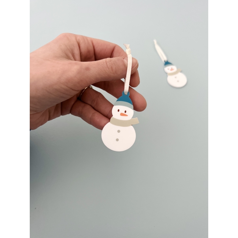 Lot de 2 suspensions bonhomme de neige en plexiglas gloss blanc imprimé avec ruban champagne, à suspendre pour décorer votre arbre à décorer au fil des saisons.