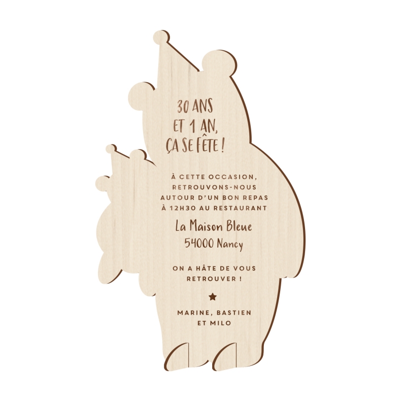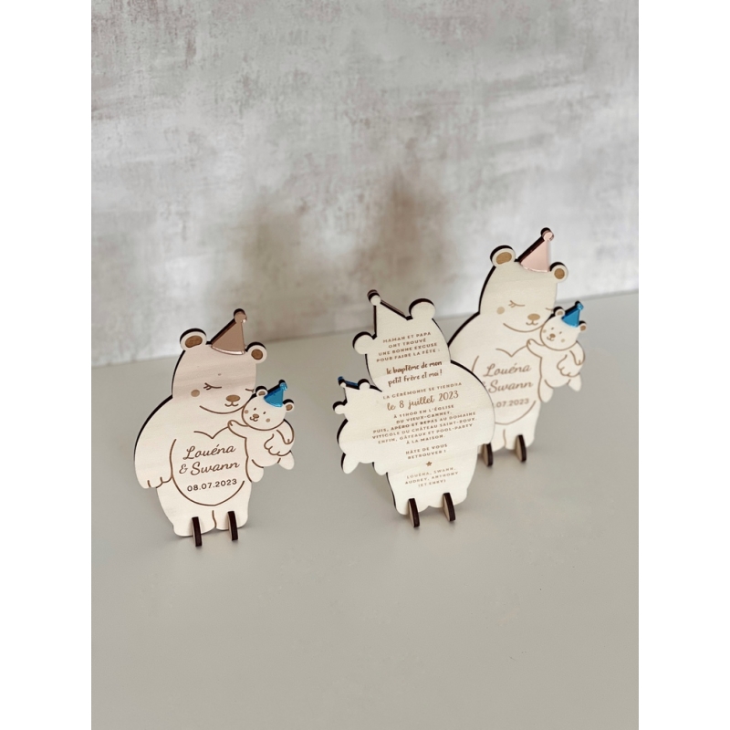 Vous organisez votre anniversaire en même temps que celui de votre enfant ? Cette invitation duo est faite pour vous ! Vos invités comprendront instantanément que vous organisez un double anniversaire en voyant cette jolie illustration de deux oursons avec leurs petits chapeaux de fête. Une invitation d'anniversaire originale et unique à conserver en guise de décoration.