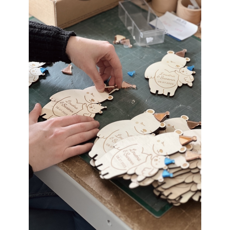 Le bois est un matériau naturel d’origine végétale, de ce fait les couleurs peuvent varier et comporter des nuances dans les teintes. Par conséquent, l’intensité de la gravure est influencée par la nature du bois.