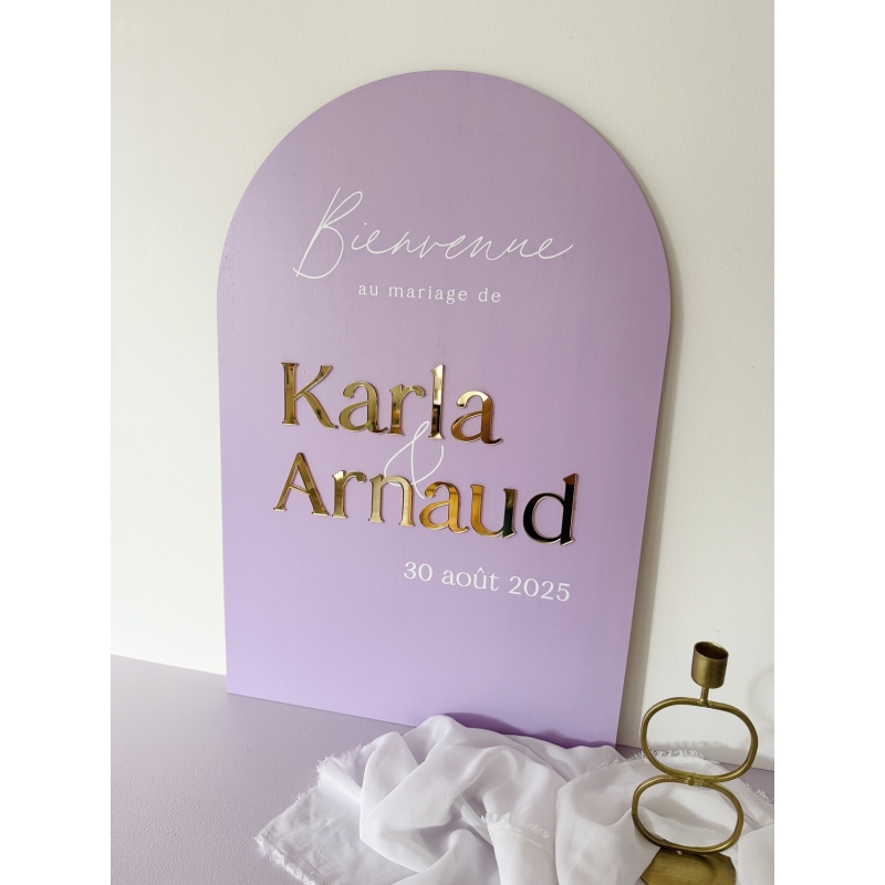 Accueillez vos invités avec un panneau de bienvenue de mariage personnalisé en bois peint. Choisissez le coloris du fond et sublimez vos prénoms en plexiglas miroir pour un rendu chic et élégant. Une décoration de mariage unique, fabriquée en France, qui deviendra un précieux souvenir de votre grand jour.
