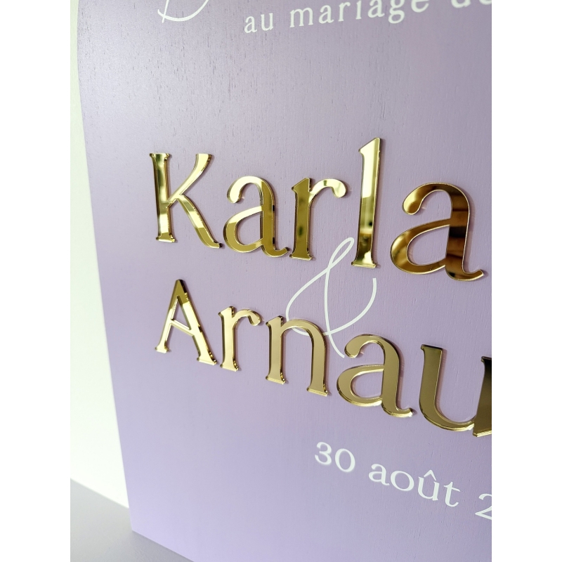 La commande du panneau comprend la personnalisation avec vos prénoms et la date de votre mariage, ainsi que sa fabrication selon le coloris indiqué. L'option finition "Ajout de plexiglas" est disponible si vous souhaitez mettre en lumière vos prénoms grâce à une application de plexiglas miroir (en sus).