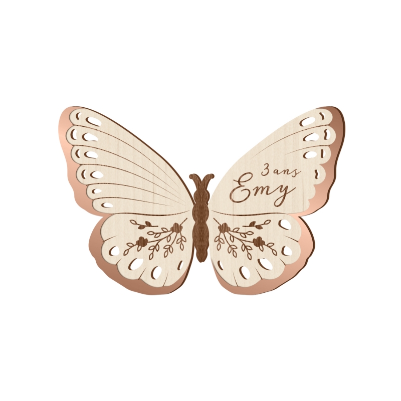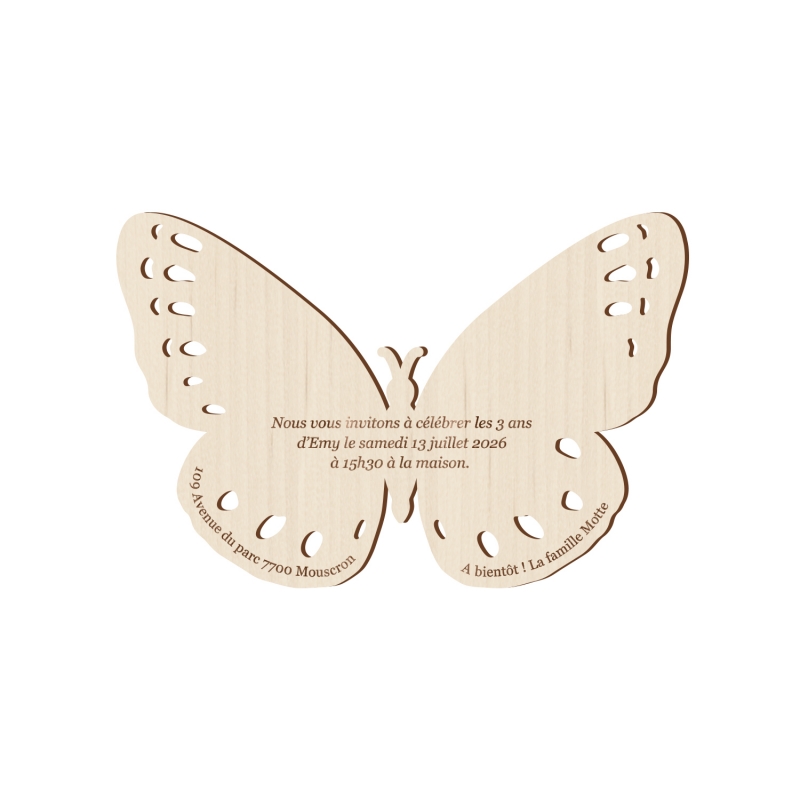 Fêtez l'anniversaire de votre enfant autour du thème des papillons. Grâce à nos invitations en bois, vous pourrez informer votre famille ou ses amis de manière originale, élégante et dans le thème. Sur le recto du papillon, inscrivez son prénom et son âge ou la date ; et au verso, un petit texte d'invitation.