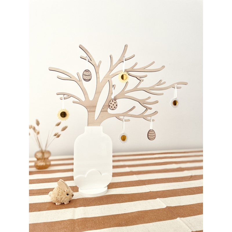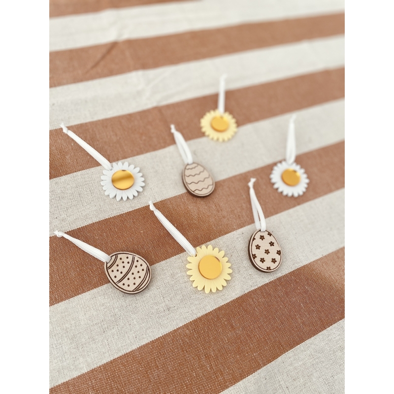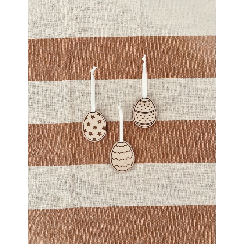 Lot de 3 petits oeufs de Pâques en bois ou en plexiglas miroir à accrocher dans votre arbre de Pâques intemporel. Le trio est composé d'un oeuf rayé, d'un oeuf à fleurs et d'un oeuf à pois.