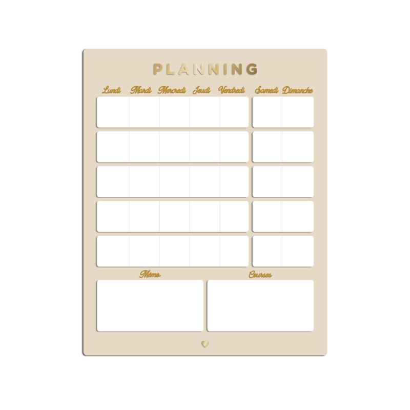 Le fond du planning est disponible en bois brut ou avec peinture terracotta, sauge, rose poudré ou lin. Les cases et titres sont en plexiglas.