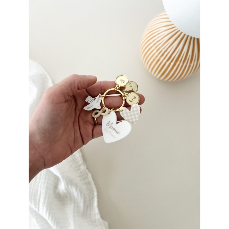 Les breloques décoratifs (le coeur vichy, la colombe ou le symbole de l'infini) apportent une dimension poétique et intemporelle à ce porte-clés, tout en restant doux et faciles à assortir au quotidien. Léger et résistant, il accompagne Mamie partout : sur ses clés de maison, de voiture ou accroché à un sac.