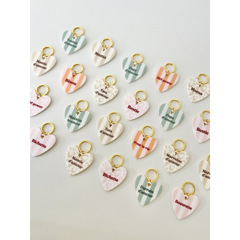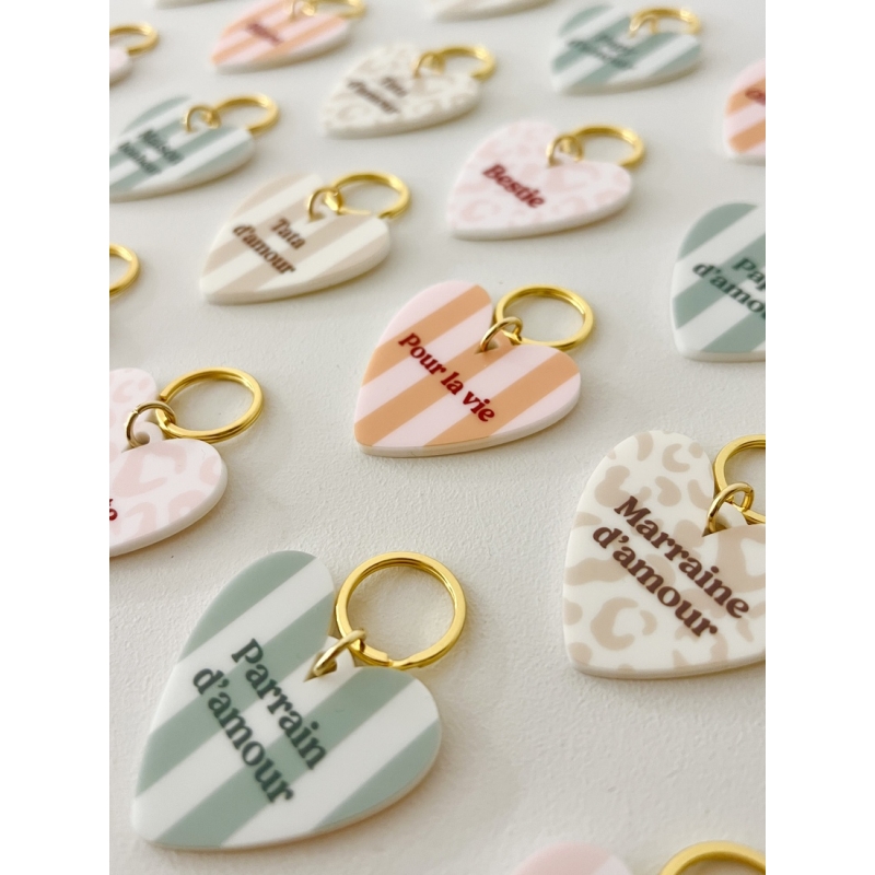 Le porte-clés cœur “Pour la vie” symbolise un lien fort et durable. Son design coloré et ses déclinaisons de motifs en font un accessoire à la fois décoratif et chargé de sens.