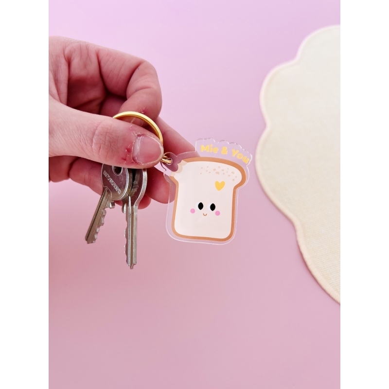 Avec son message "Mie & You", ce porte-clés brioche revisite avec humour le célèbre jeu de mots amoureux. Une petite déclaration gourmande qui séduira tous les fans de viennoiseries. Sa forme de tranche de brioche et son design expressif en font un accessoire aussi amusant qu’attachant. Ce porte-clés est un clin d’oeil à l’univers réconfortant du matin : brioche moelleuse, tartines dorées et douceurs du petit déjeuner. Accroché à un trousseau de clés, un sac ou une trousse, il apporte une touche joyeuse et originale au quotidien.