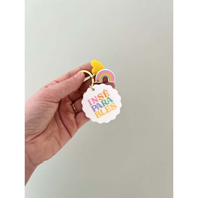 Joli porte-clés haut en couleurs composé de 3 breloques : un macaron blanc avec l'inscription multicolore "inséparables", un arc-en-ciel aux couleurs pastel et un coeur jaune. Un grigri porte-bonheur à emmener partout avec vous !