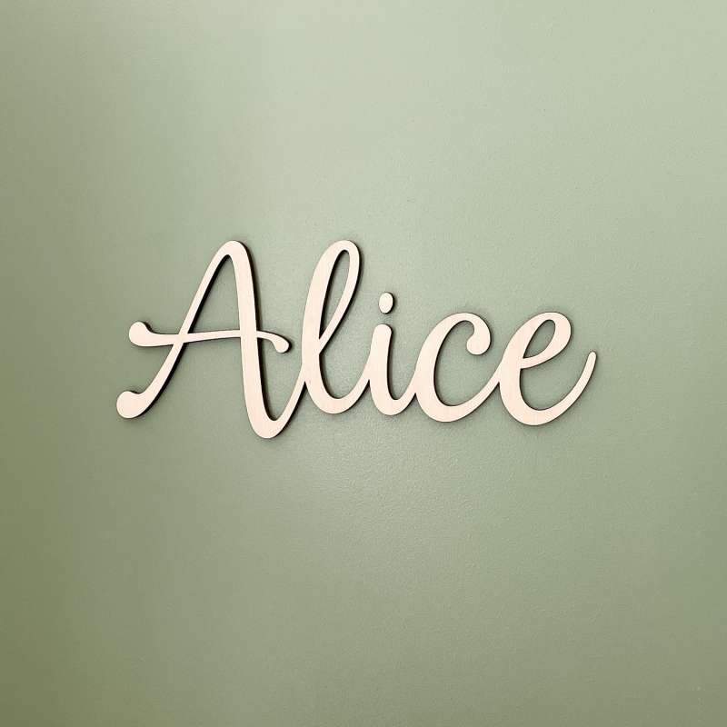 La commande comprend la personnalisation du prénom en bois selon la longueur sélectionnée dans le menu déroulant ; la hauteur s'adapte à chaque prénom.