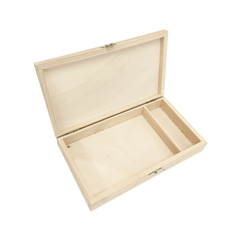 Joli coffret en bois personnalisable avec votre logo ou le texte de votre choix. La boîte se compose de deux compartiments : d'un côté, vous pourrez mettre des tirages photos et de l'autre une clés USB (non fournie).