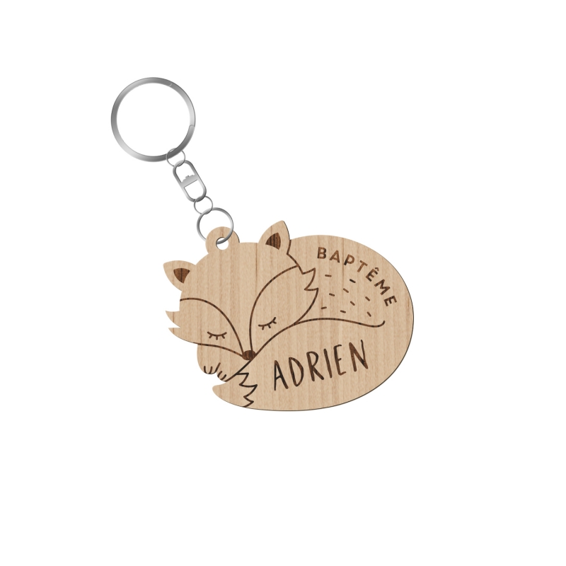 Pour le baptême de votre enfant, offrez des cadeaux d'invités originaux et personnalisés : des porte-clés en bois ! Ce modèle est en forme de mignon petit renard endormi personnalisé avec le prénom de votre enfant et la date de son baptême.