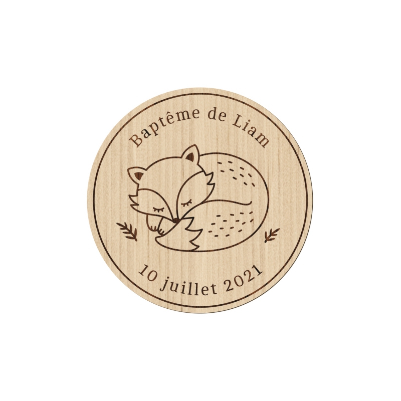 Personnalisez ces magnets en bois illustrés d'un petit renard endormi. Ils feront un cadeau d'invité orignal et unique pour un anniversaire ou un baptême sur le thème de la forêt