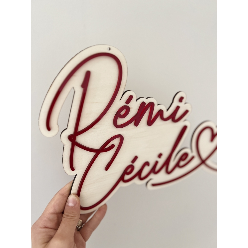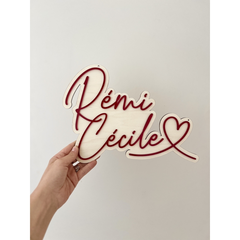 Pour que la composition soit harmonieuse au maximum selon vos prénoms, l'emplacement du coeur peut varier. Nous réalisons l'enseigne sur-mesure et nous nous assurons que le produit final est à la fois harmonieux visuellement et solide pour l’envoi. Vous n'aurez donc pas la même composition que le modèle présenté sur les photos.